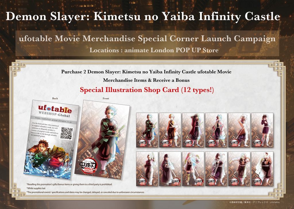 Also if you buy any 2 products from the Demon Slayer: Kimetsu no Yaiba Infinity Castle ufotable Theater range you get 1 of 12 art cards for free