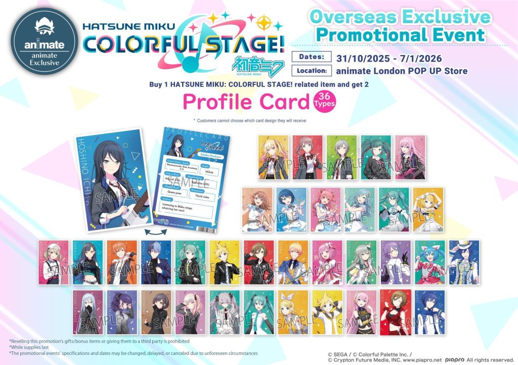 HATSUNE MIKU: COLORFUL STAGE! with its own set of Animate arts cards this time a huge 36. You will get one free with any HATSUNE MIKU: COLORFUL STAGE! product