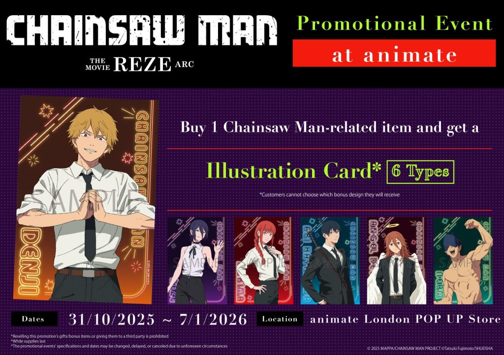 Next up is Chainsaw Man – The Movie: Reze Arc Promotional Event if buy any Chainsaw man product in store you will get one of six art card each with a diffent Chainsaw man cast member on it ( I hope I get beam)